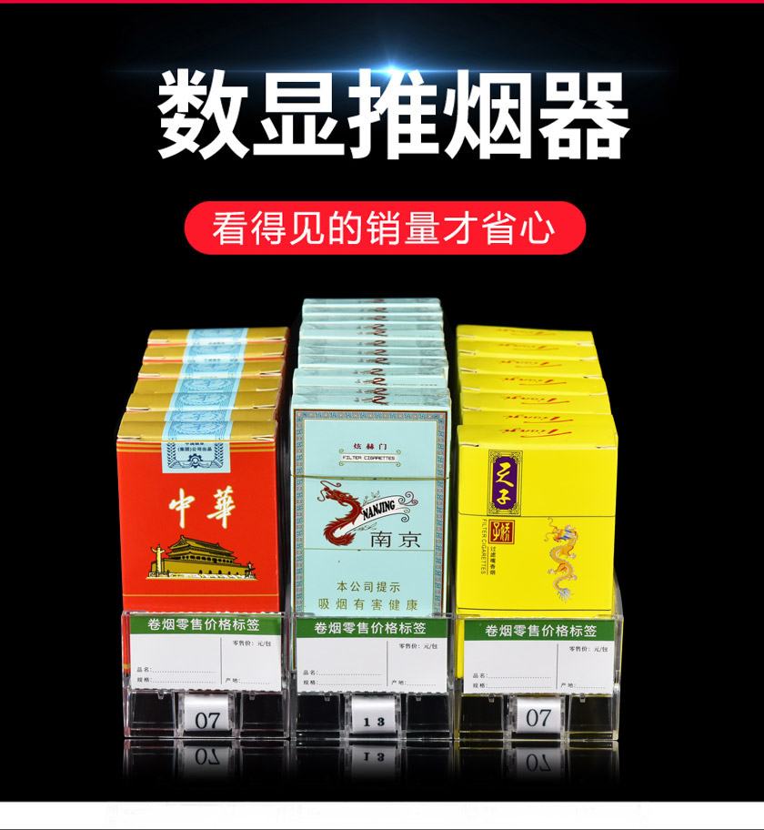 当客人取走摆放在数显推烟器上面的第一个商品后,后面的商品会自动的往前推,始终让商品展示在第一位,大大提升了商品的展示能力,不需要专门组织人工去整理货物,节省人工和成本。